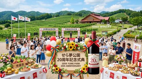ワイン広島・世羅町のせら夢公園が開園20周年を迎え、記念式典が開催されました。地元産ぶどう100%使用のせらワイナリーから限定ワインも発売され、地域のぶどう生産者や観光関係者約60人が集い、地域活性化と観光振興を祝いました。